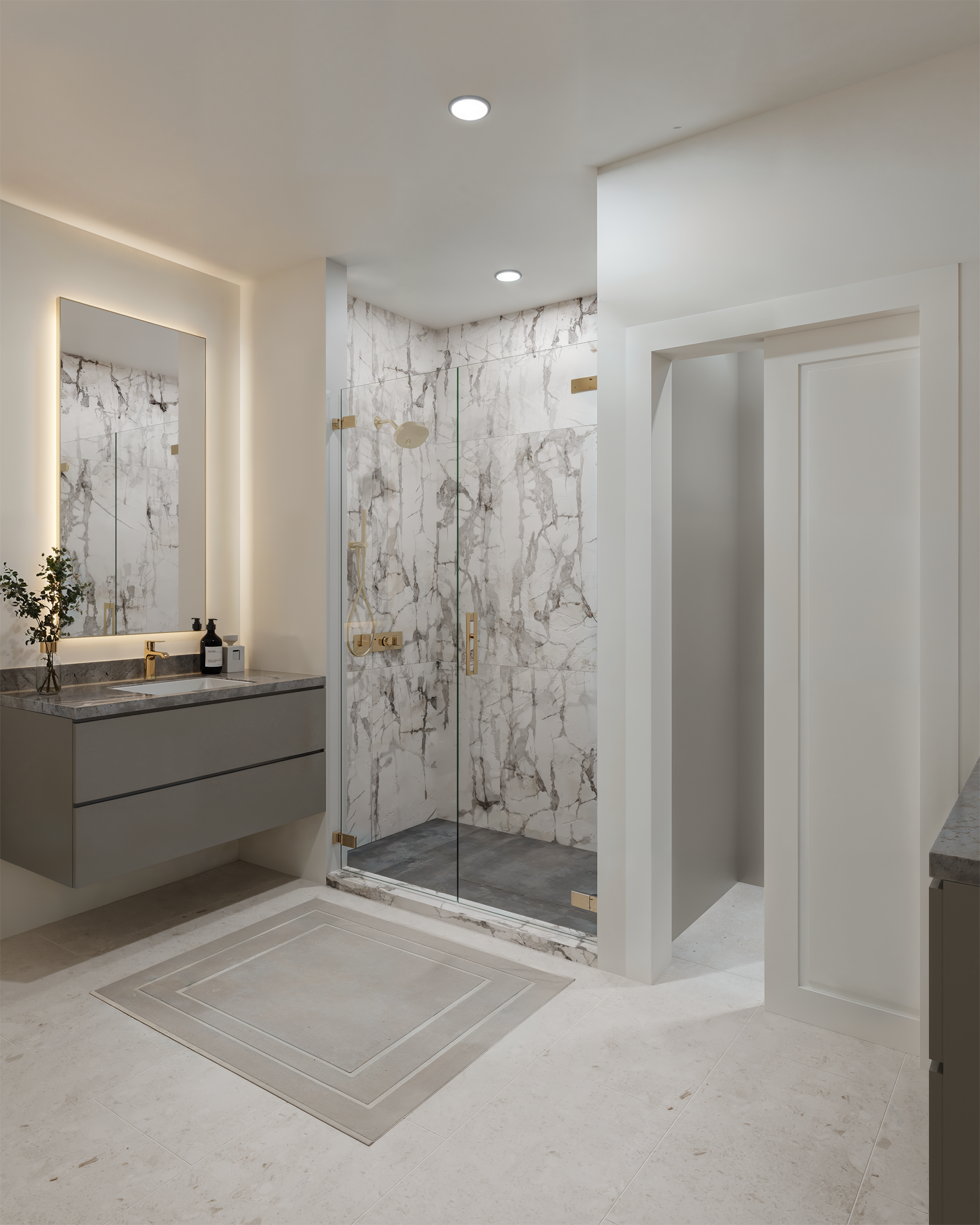 Select residences include dens featuring a custom-designed wall of glass. The bathrooms are equally refined, with some offering contemporary light fixtures, French gold Kohler plumbing, and backlit mirrors. The bedrooms serve as a serene retreat from the vibrant city, offering understated elegance and comfort.