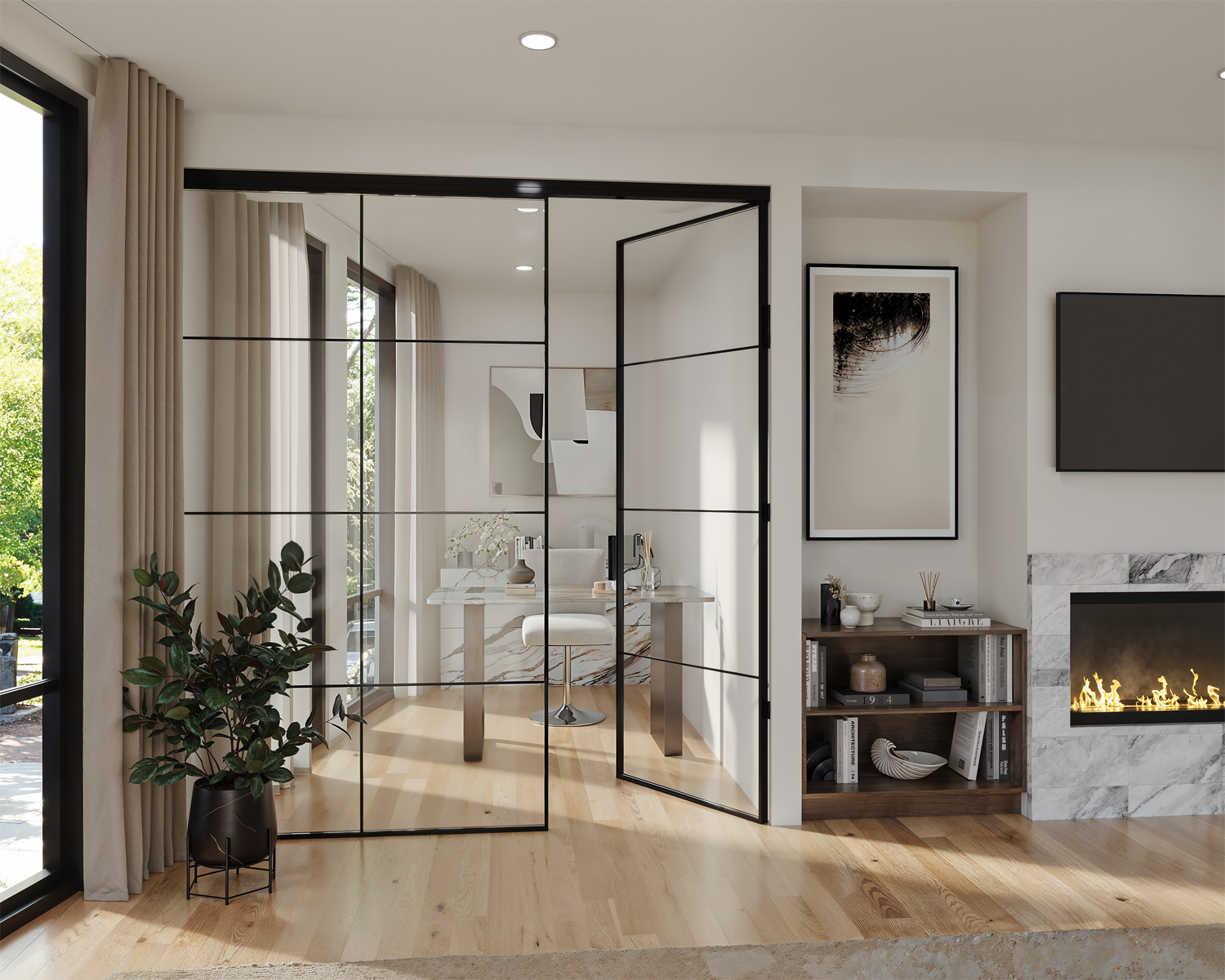 Upon entering, you're immediately drawn to the oversized floor-to-ceiling Drutex windows that accentuate the soaring nine-foot ceilings. These expansive windows flood the interiors with natural light and showcase the warmth of the home. The open-concept living and kitchen area is designed for effortless entertaining and a highly personalized living experience. The family room includes a cozy fireplace, while the kitchen impresses with waterfall-edged stone countertops, Dell Anno two-tone cabinetry, and top-of-the-line Thermador appliances. Elegant wood accents add texture and warmth, and a striking six-foot Eurofase linear chandelier above the island ties the space together.